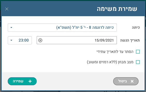 לסיום ושיוך המשימה לכיתה, יש ללחוץ על הכפתור "שמירה", לבחור תאריך יעד להגשת המשימה ולשמור את המשימה.
