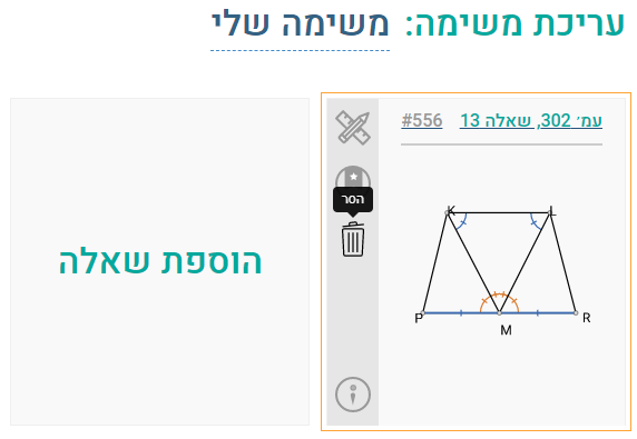 ניתן לשנות את סדר השאלות ע"י גרירה, ולהסיר שאלות מהמשימה באמצעות הכפתור "הסר" (איקון פח אשפה):