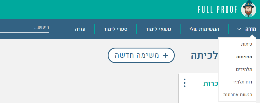 כדי ליצור משימה לכיתה יש להיכנס לדף משימות בתפריט מורה, לבחור בכיתה המתאימה ברשימה בצד שמאל, וללחוץ על משימה חדשה.