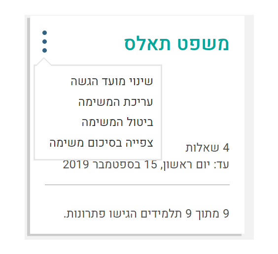 אפשרויות נוספות במסך זה הן החלפת כיתה, בחירת תאריך חשיפה שרק אחריו המשימה תהיה פתוחה לתלמידים, והגדרת המשימה כמשימת מבחן. מידע נוסף על מצב מבחן.